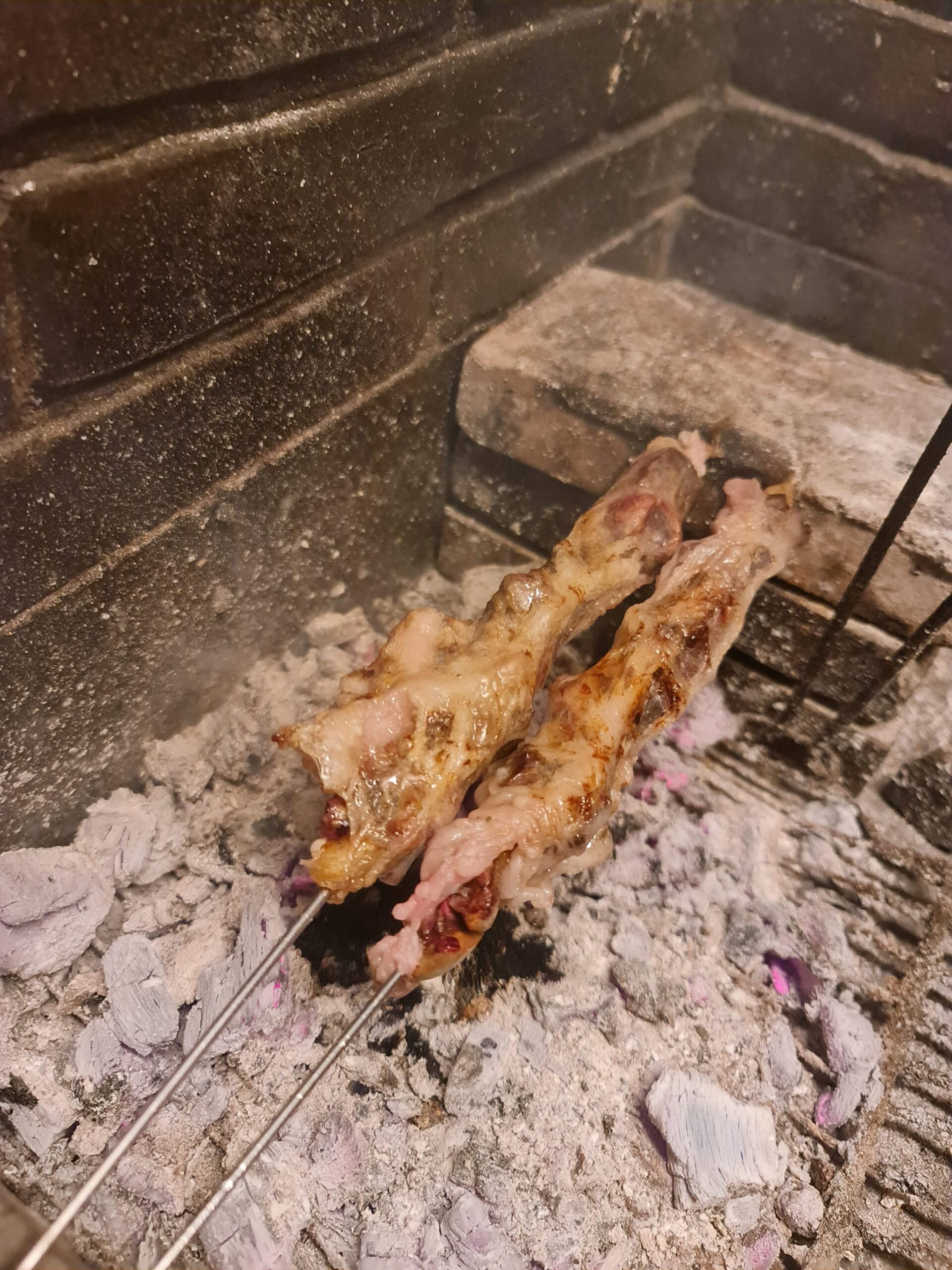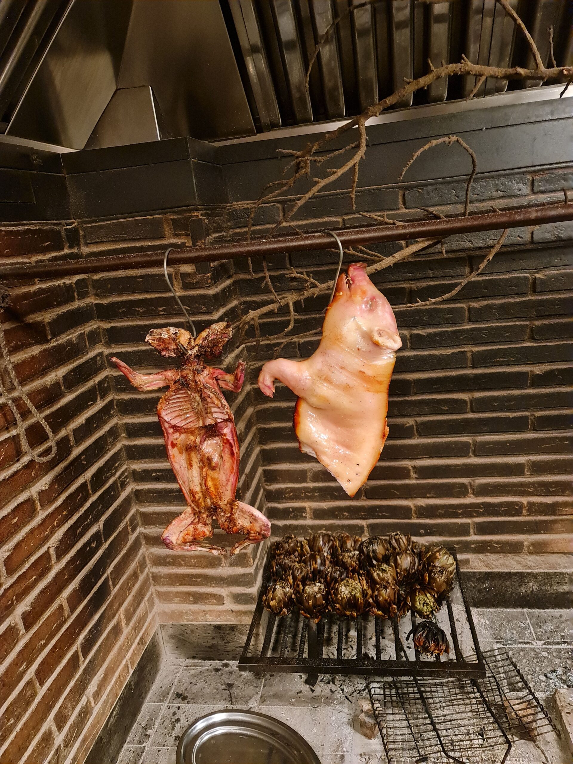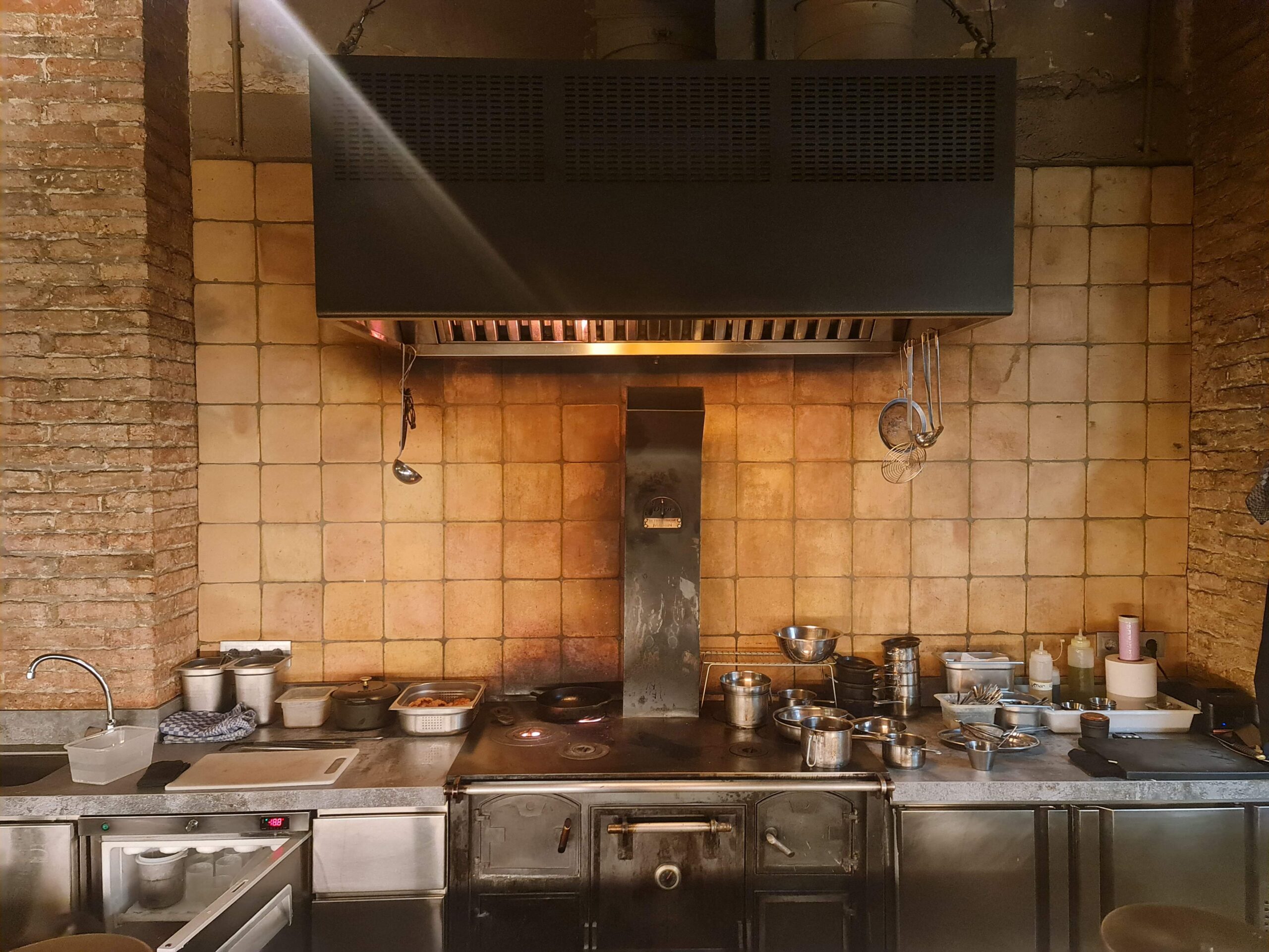 Al fons del local tenim l’asador. Un espai on em fet sorgir l’ànima del local, amb les vigues de ferro i fustes càlides que acompanyen millor un àpat més tranquil. Aquí tot es cuina amb foc d’alçina, roure o olivera. Tenim una cuina econòmica, un forn de llenya, un fumador i unes parrilles per tractar cada aliment amb el que millor l’escaigui.